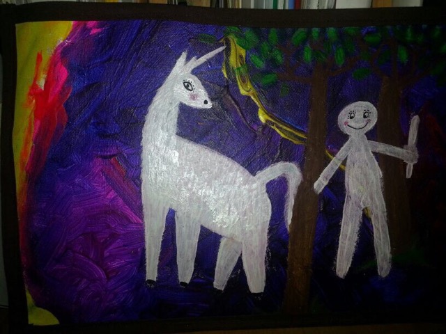 “Érase que se era una vez, dos niños que vivían en Serranillos con sus papás. Tenían un tío que se llamaba David, un poco bicho y dos abuelos. Un día pasó algo terrible: mientras los abuelos estaban cantando con la guitarra “El Señor Don Gato”, dejaron la puerta de atrás abierta y se coló un unicornio. El padrino pensó que era bueno, como en la canción de Silvio, y se equivocó, lo tiró de la silla y le dijo a los niños: