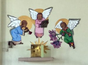 Me vinieron a la cabeza los templos del medievo, cuando pintores, tallistas y escultores plasmaban diferentes escenas y figuras para que el pueblo –por aquel entonces analfabeto- pudiera entender mejor los textos sagrados. Esa fue la razón de los retablos y de tantísimas otras obras artísticas que contemplamos con asombro y delectación. Salvando las distancias, los católicos kikamba de la diócesis de Kitui se parecen a aquellos cristianos de la antigüedad, pues buena parte de la población no sabe leer ni escribir. Además, la Iglesia católica siempre se ha servido de las obras artísticas como representación de los misterios que unen Cielo y Tierra.